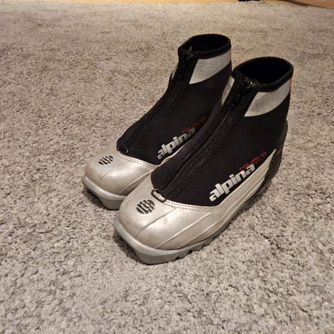 Alpina skisko med svart og grå farge. Skiskoene har snøring og glidelås for god passform. Egnet for bruk ved langrenn eller andre skiaktiviteter. Liten i størrelsen. Uten innersåle.