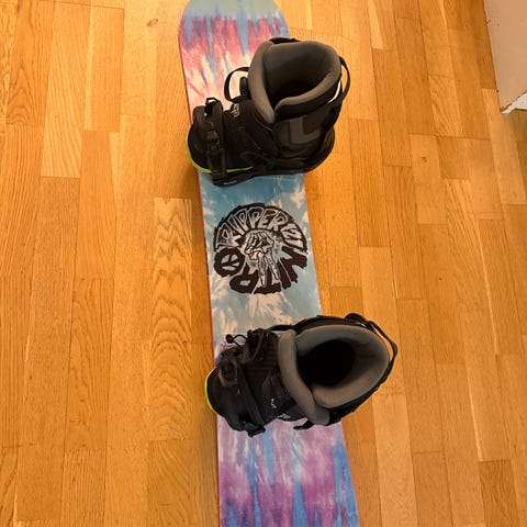 Spirit 121 snowboard med tilhørende bindinger. Brettet har en lengde på 121 cm og en fargedesign i blåtoner med hvit tekst. Bindingene er svarte med justerbare stropper og polstret fotplate for støtte og komfort.