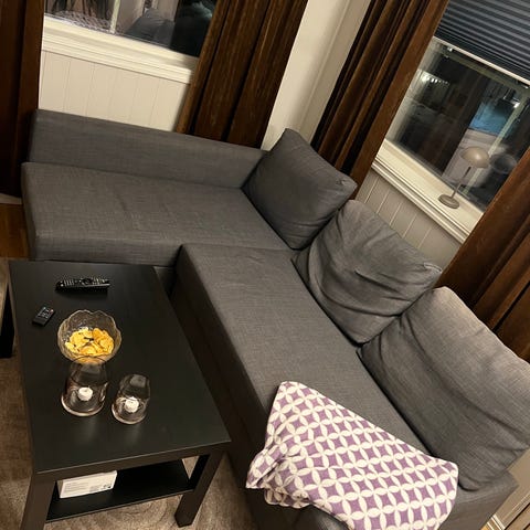 Lite brukt sovesofa med sjeselong og oppbevaringsplass.