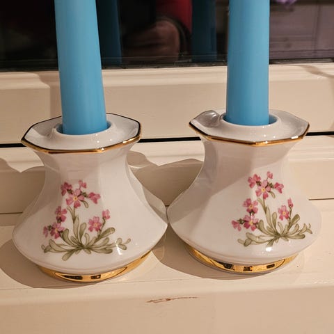 Nydelig små lysestaker fra flores verni selges samlet. Nærmest plettfri stand,klarer ikke finne noe på de. Ca 7,5 cm høye. Dekorert med gullkant og vårblomster