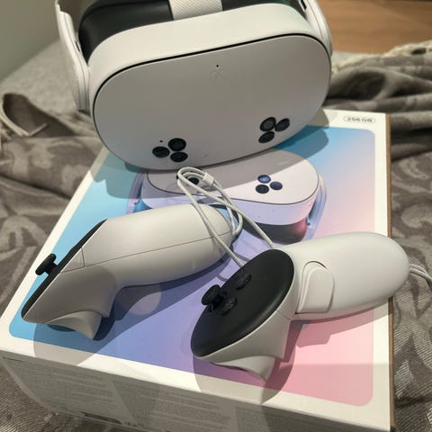 Meta Quest 3S, 256GB VR-headset i hvit farge med tilhørende kontrollere. Produktet tilhører kategorien Annet innen konsoller.