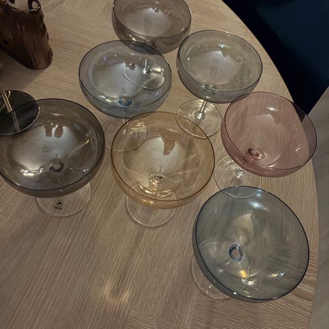 Magnor Glassverk champagneglass i blått og ravfarget glass. Glassene har stett og er designet for servering av champagne eller andre musserende viner. Perfekt glass til cocktail. Passer til bruk ved ulike anledninger og samlinger. Kan hentes på Hosle eller Oslo sentrum.