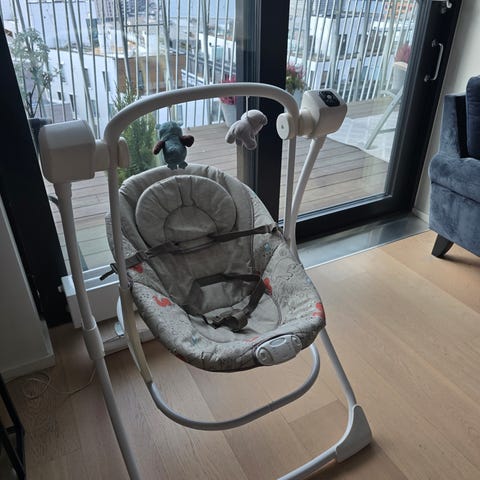 Elektrisk gyngefunksjon med kontrollpanel, svinger i ulike hastigheter og den kan spille musikk.