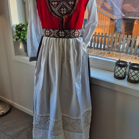 Pen Hardanger bunad til salgs. Størrelse M/L Medfølger skjorte, forkle, og bringeduk. Vest Lende 52 cm Bredde 47 cm. (Rund 94 cm) under arm ( rund 94 cm). Stakk lengde 89 cm plus 9 cm til å forlenge. run liv 84 cm. Kan forlenge 6 cm. Bringe duk lende 24 cm bredde 31 cm. Forkle lende 66 cm bredde 54 cm rund liv 166 cm. Med knytebånd Skjorten lende 56 cm bredde 56 cm ( rund 112 cm ) arm fra nakken 75 cm rund hals 40 cm. Størrelse M/L