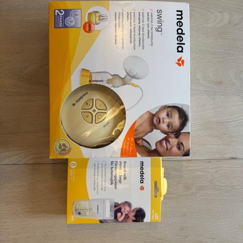 Medela Swing elektrisk brystpumpe med tilbehør inkludert brystmelkoppbevaring. Produktet er designet for effektiv pumping av brystmelk og inkluderer flaske, pumpeenhet, og nødvendige koblinger.