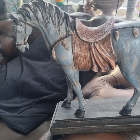Treskåret veggdekorasjon med hestemotiv i lyst tre