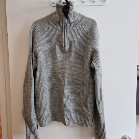 Ulvang høyhalset genser i ull, størrelse M for dame. Genseren er hvit og laget av ullmateriale. Den har en høy hals og ribbestrikket struktur.