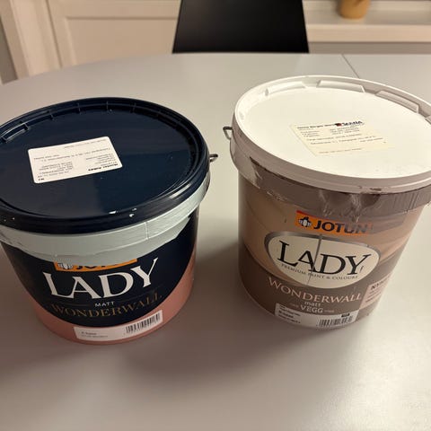 Jotun Lady Perfection veggmaling i fargen 'Tak'. Produktet er en premium maling med soft matt finish, egnet for innendørs bruk. Og ca halvt spann med sparkel