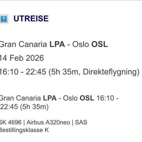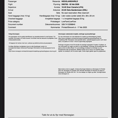 Norwegian Air Flyreise tur/retur Oslo 30.01-09.02 gran canaria