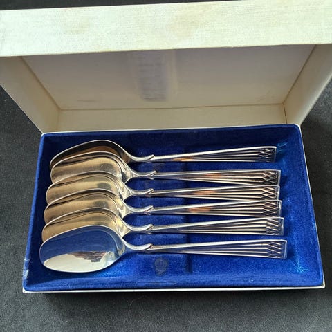1 stk teskje.nypris 719.kr 114 mm.2 stk smørgafler 124 mm.nypris 1073 kr pr stk.1 stk.liten syltetøy skje.130 mm.nypris 964 kr. 2 stk serveringskjeer 180 mm.kompottskje/ kaffe,dessert krem.nypris.2949 kr pr stk.samlet verdi.9727,- selges for halve prisen.dvs 4863,- for alt.