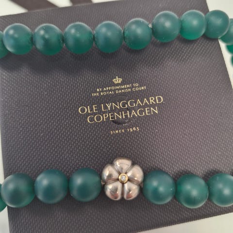 Halssmykke i vaker, lysende grønn sten. Dubber som passer til Ole Lynggaard sine smykkelåser. Lengde 42 cm.