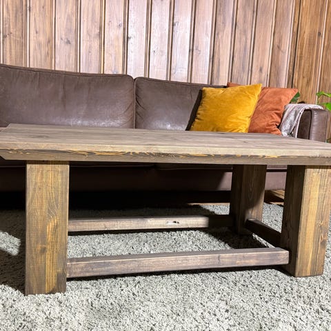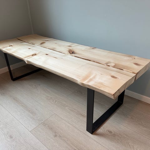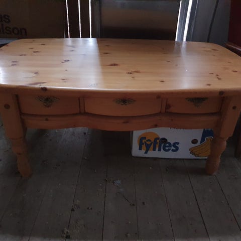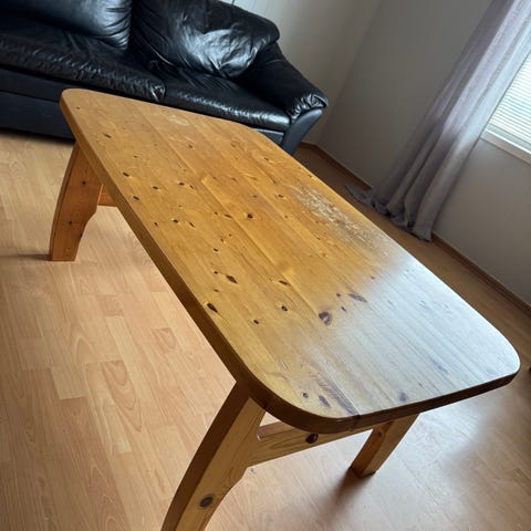 Hjemmelaget salongbord i 15mm kryssfinér av furu gis bort mot henting. Bordet er behandlet med Osmo dekorvoks i fargen eik antikk, som gir et fint spill i treverket.