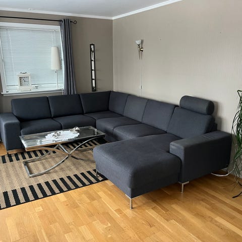 Stor hjørnesofa selges, lite brukt da den har stått i egen ferieleilighet. Vinklene på sofaen kan endres. Kjøpt på Møbelringen for noen år siden.