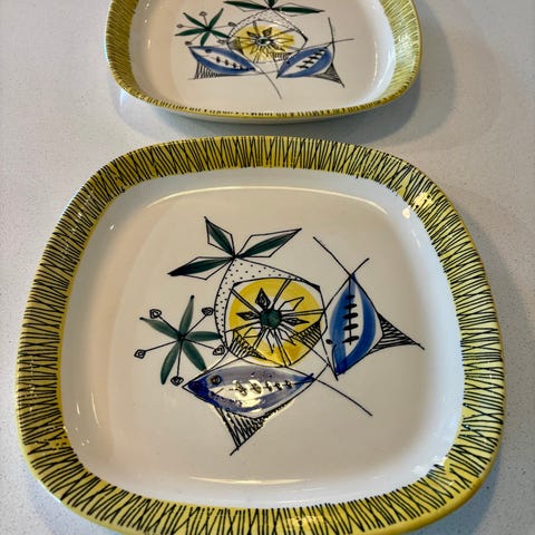 Flott Flamingo Bambus serveringsfat fra Stavangerflint. 26x16 cm. Høyde 4cm. Dekor av Turid Waage. Vintage. Produsert på 1950 tallet. Flotte farger i dekoren.