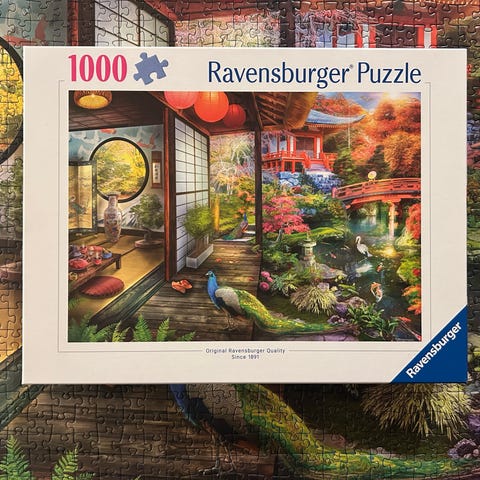 Ravensburger Puzzle med 2000 brikker. Puslespillet har et motiv av en hage med blomster, en bro og et hus i bakgrunnen. Egnet for voksne og barn som liker puslespill med mange brikker.
