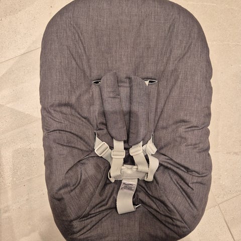 Selger vårt nyfødtsete til tripp trappstol. Setet er av nyere modell, så det kan brukes i to forskjellige vinkler. Den ene innstillingen er liggende, så setet kan bruker fra fødselen.