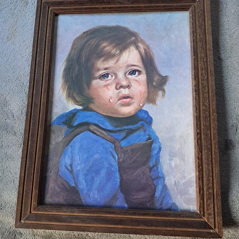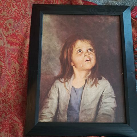 Retro kitsch frå søttitalet. Giovanni Bragolin produserte mange slike, dei var kjende og kjære på mange veggar i si tid. Søte og triste.