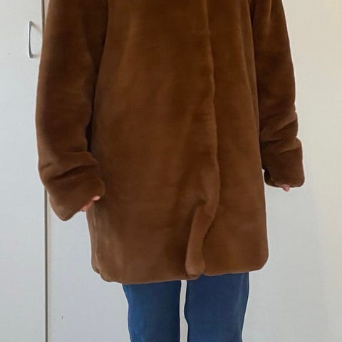 ella&il Annet yttertøy i fuskepels i størrelse XL for dame. Jakken er grønn og laget av fuskepelsmateriale. Den har hette og er egnet for utendørs bruk.