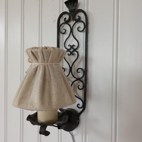 3 stk vel fungerende klassiske smijern vegglamper med klassiske lampeskjermer. Lampene er nesten helt like, men en har litt forskjell på lampekransen, og forskjell på ledninger med jordet og ikke jordet støpsel, også en uten av/på bryter, alle med brune ledninger, ca. 1,75m. Sokkel passer for E27 pærer, pærer er ikke inkludert. De 3 skjermene er ca. 12cm høye, diameter på ca. Ø15cm.
