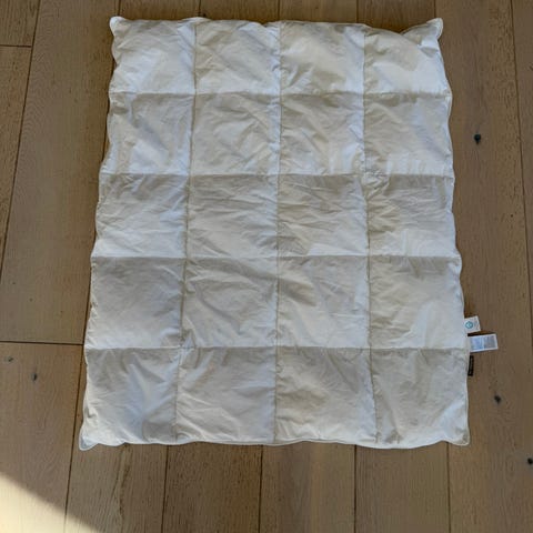 Babydyne med pute selges med 4 sengetøysett. Det grå og det blå med fantorangen har jeg ikke putetrekk til.