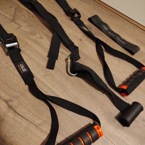Xcore Pilatesring med tilbehør inkludert bånd og manualer. Brukt for styrke- og fleksibilitetstrening, egnet for hjemmebruk eller i studio.