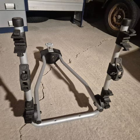 Thule sykkelstativ for bil med plass til to sykler. Laget i metall, designet for montering på bilens tilhengerfeste.