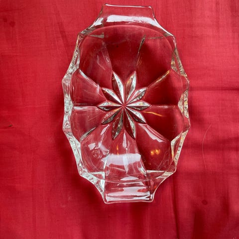 Fint glassfat , antakelig pressglass . Tung og massivt . 17 cm høyt og 20 cm vidt.