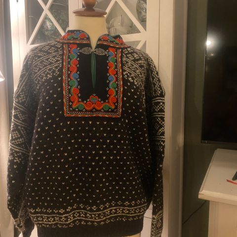 Pent brukt strikkegenser fra 90 tallet. Litt nupper, men mye genser og varme igjen. Er satt på et OL merke, men usikker fra hvilket OL. Hjemmestrikket