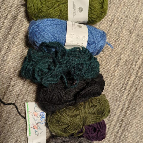 Seks nøster med garn av ukjent garntyper selges. Ca 300g.