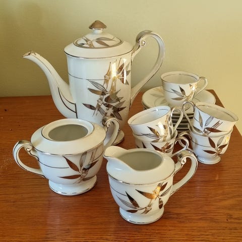 Pent brukt med normal alders- og bruksslitasje, hovedsakelig i kanter. Ingen sprekker eller vesentlige skader. Fremstår som et komplett og dekorativt sett.