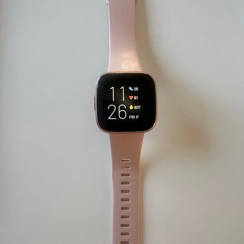 Fitbit Versa 2 smartklokke i rosa. Enhet med berøringsskjerm og silikonrem. Designet for å måle aktivitet, søvn og helseparametere, egnet for daglig bruk.