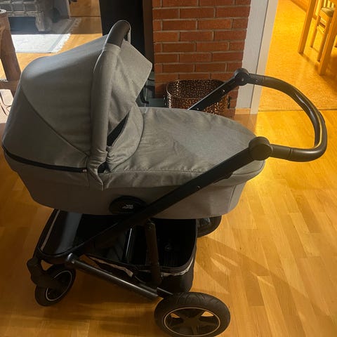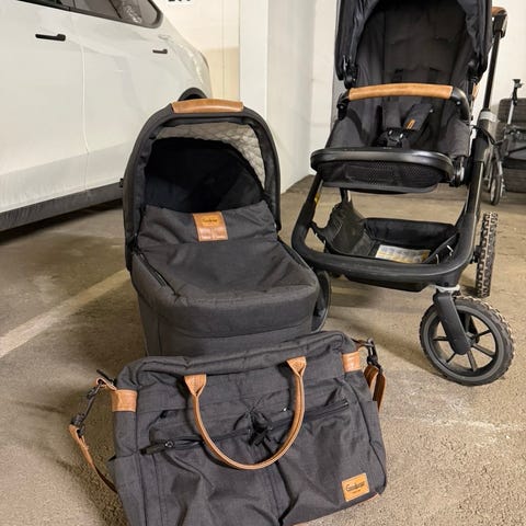 Det følger også med ekstra utstyr: vognpose til sitte del, stelleveske og liten veske.