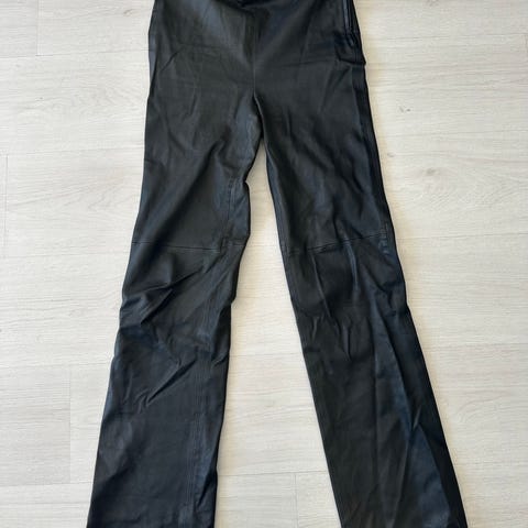 Skinnbukse i saueskinn, str 38. Buksen har strech, glidelås i siden og nederst ved ankelen. Behagelig å ha på! Buksen er ikke brukt, og selges halv pris kr 1750.