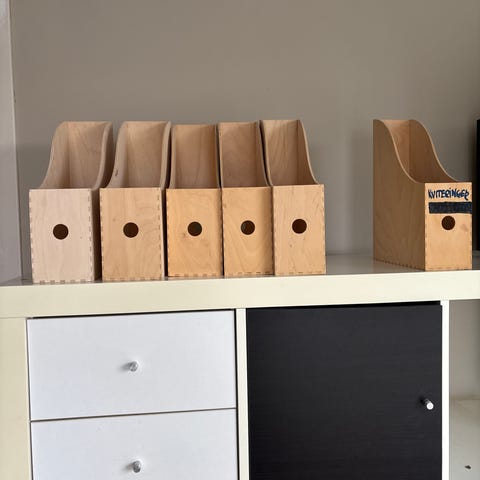 Avis- og magasinholder laget av tre og metall. Designet for oppbevaring av aviser og magasiner, med et enkelt og funksjonelt utseende.