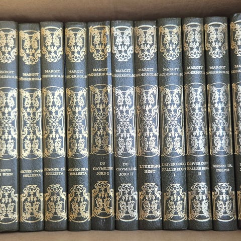 Margit Söderholm bokserie bestående av flere bind med ulike titler. Bøkene har brune omslag med gulltekst på ryggen. Serien inneholder flere romaner og fortellinger av forfatteren Margit Söderholm.
