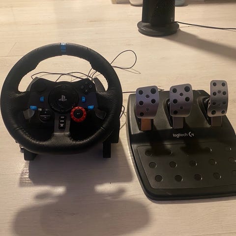 Logitech G29 Racing Wheel med pedalsett og girspak. Utstyrt med ratt med knappkontroller, tre pedaler (gass, brems, clutch) og manuell girspak. Designet for simulert kjøring og kompatibel med PlayStation 3, 4 og 5. Må hentes.