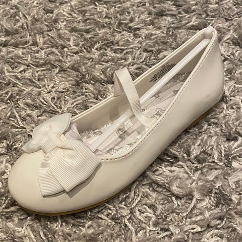 Next pensko for jenter i størrelse 22. Skoene er hvite med en stropp over vristen og har en dekorativ spenne.