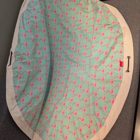 Leketeppe som også blir til praktisk pose ved å dra i snorene. Skal egentlig kunne brukes som en bag, men jeg har rotet vekk stroppen under flytting. Fungerer fortsatt som bag ved å holde i tauet som strammes. Veldig fint design. Fra play&go.