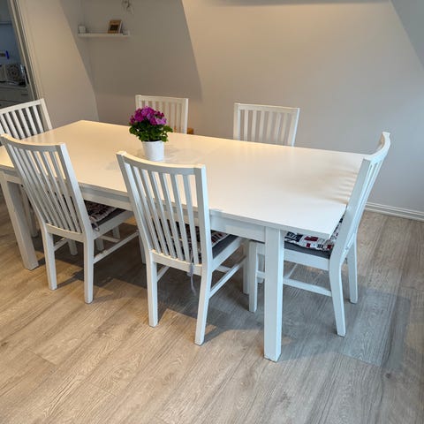 6stk solide stoler som det følger med nytt trekk til om ønskelig. Stolene har noen små merker etter å ha truffet bordkant.
