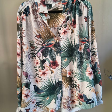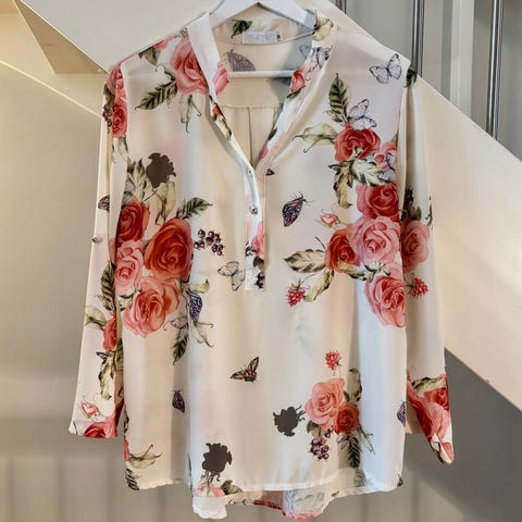 Blomsterprint, passer nok best en str 40-42. 100%viskose