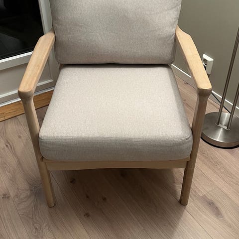 Stolen ble kjøpt i desember 2024 ved innflytting i nytt hus. Dessverre har den bare blitt tatt ut av plasten og blitt stående i et eget rom uten å bli brukt da vi gikk en annen retning med tanke på interiør.