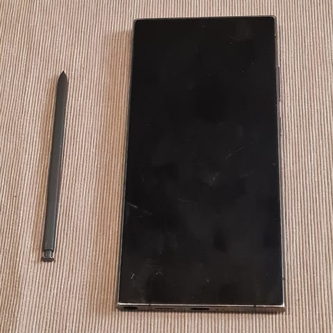 Samsung Galaxy S24 Ultra mobiltelefon. Telefonen har flere kameraer på baksiden og kommer med en tilhørende penn. Inkluderer original emballasje, ladeledning og deksel.