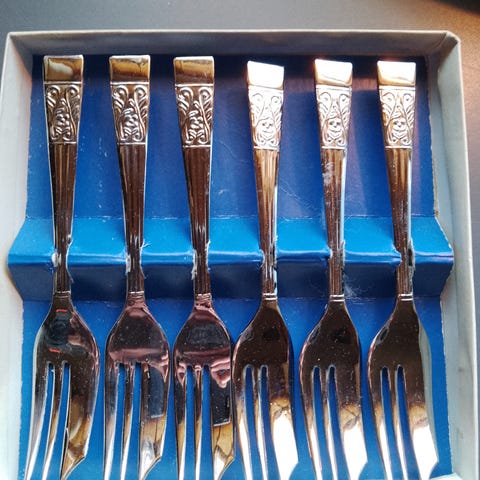 søkeord: bestikk kjøkken kjøkkenutstyr kjøkkenredskaper gaffel piknikksett piknik piknikk gafler dessert kvit hvitt kvitt vintage retro samlerobjekt samler samle samleobjekt