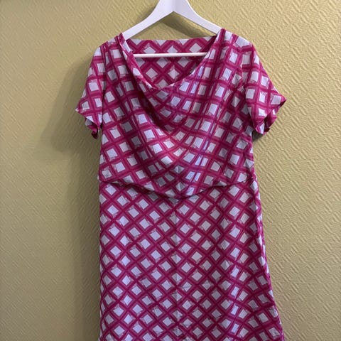 Custommade hverdagskjole i silke i størrelse 44 men føles mer som 42. Kjolen har flerfarget mønster og er laget av silke. Den har glidelås bak og er egnet for hverdagsbruk. Kjolen er foret gjennom hele. Kjolen er ny da den ble ikke brukt.