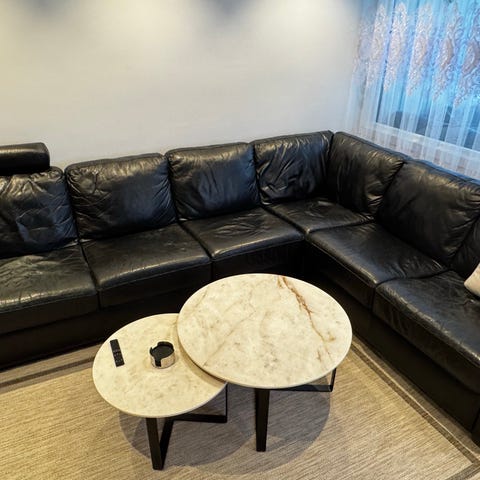 Godt brukt skinnsofa med små skader på hjørnene og slitasje i skinnet.
