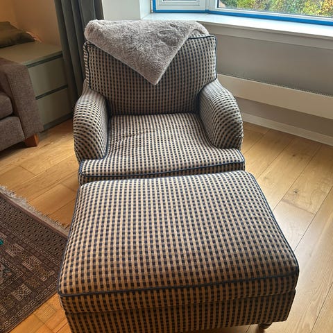 Selges grunnet flytting, kun brukt som ekstra sitteplass når jeg har gjester. Skikkelig god stol og fotskammel med oppbevaring inni - i lekre lintrekk fra Bemz. Stol og fotskammel koster 4700,- på Ikea. Lintrekkene fra Bemz koster 7299,- for stolen, og 3299,- for fotskammel. Selges samlet for 4000,-