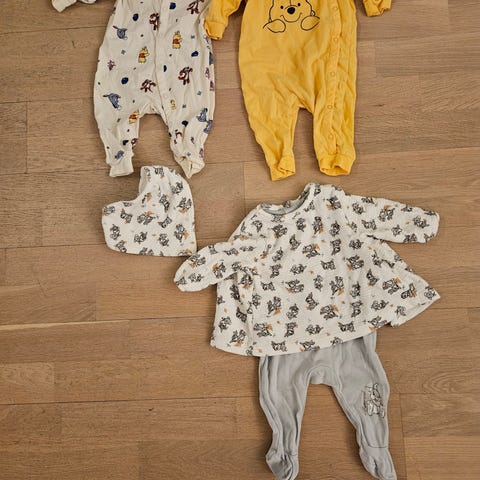 Selger en pent brukt klespakke med Disney-klær i 68. Brukt av både jente og gutt. Ene buksa har en flekk (se siste bildet). Ellers er det veldig pent brukt uten noe særlig bruksmerker av hva jeg kan se. 🩵