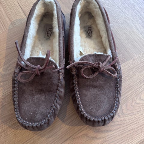 Varme Ugg Dakota i brunt saueskinn og beige pels, fremre del er skitten (kan kanskje rengjøres hvis du har et rengjøringssett for semsket skinn).