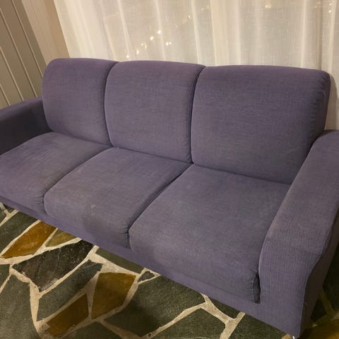 Selger en 2 seter sofa med puff, kommer i to moduler samt puff. Stått i loftstue.