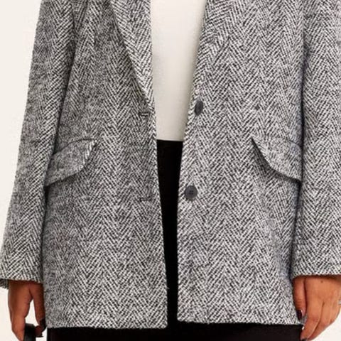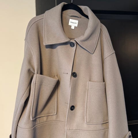Fôret jakke i ullblanding med romslig passform og knytebelte i midjen. Jakken har to store lommer foran samt lange ermer som er vide. Hovedstoff: 50%ull og 50%polyester. Fôr: 100% polyester